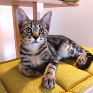 薄めのキジ柄で小顔の美人な女の子。人には少し慎重なところがありますが、フロアでスヤスヤ寝ていたり、少し離れた場所からオモチャを見つめている姿も見かけます。ゆっくり仲良くなってみてください。